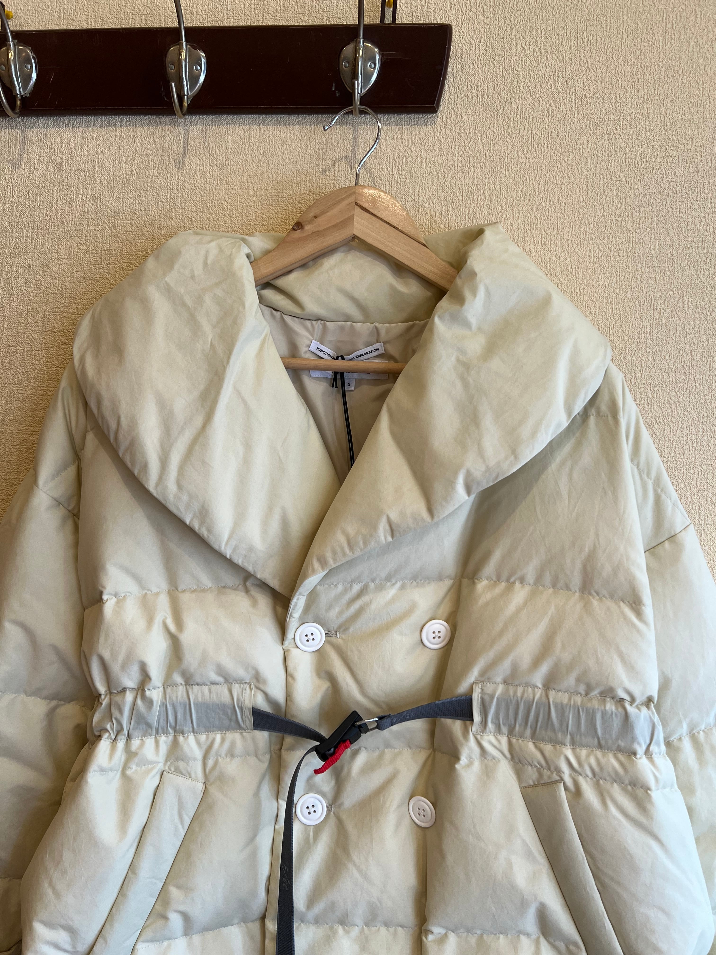 ジャケットや寝袋、布団から羽毛を回収し、丁寧に再洗浄された650フィルパワーのダウン、素材はリサイクルナイロンを使用した、ショールカラーピーコート。