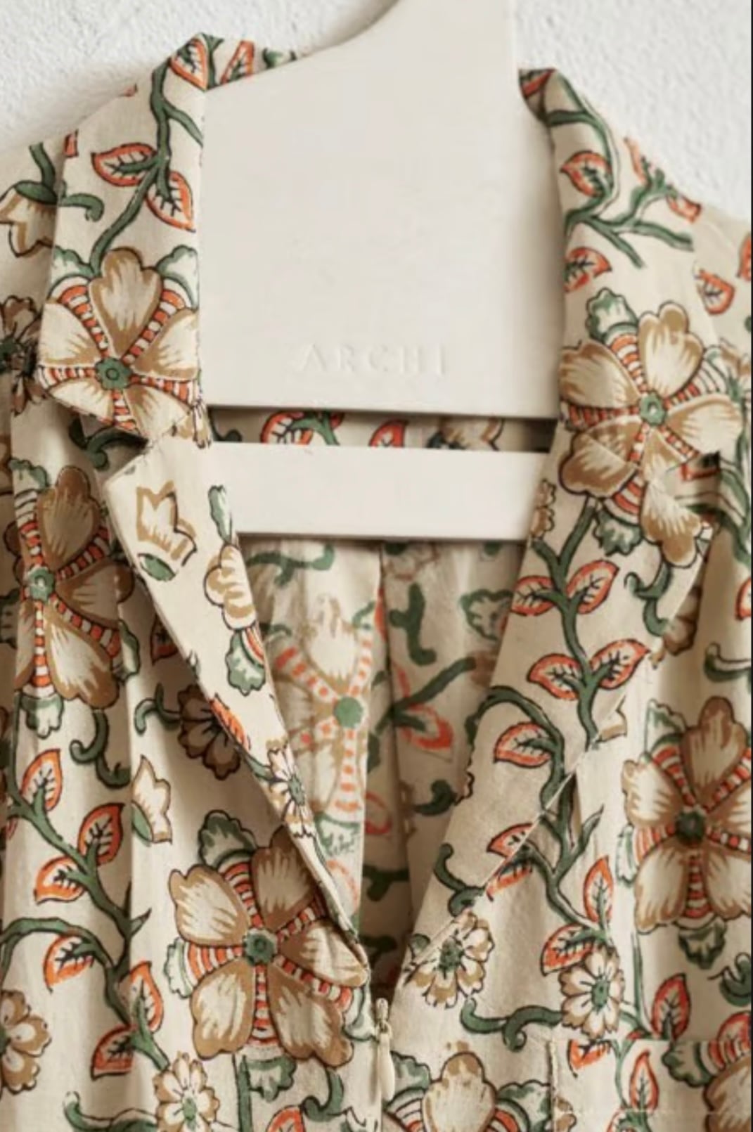 インドの伝統工芸であるブロックプリントの生地を使用したオールインワン。手彫りの木版で一つずつ丁寧にプリントされた、ぬくもりある風合いが魅力です。前はジップアップ、首元は開襟で、涼やかさと上品さを感じられるデザイン。ウエストには共布の紐が通してあり、シルエットに変化をつけられます。