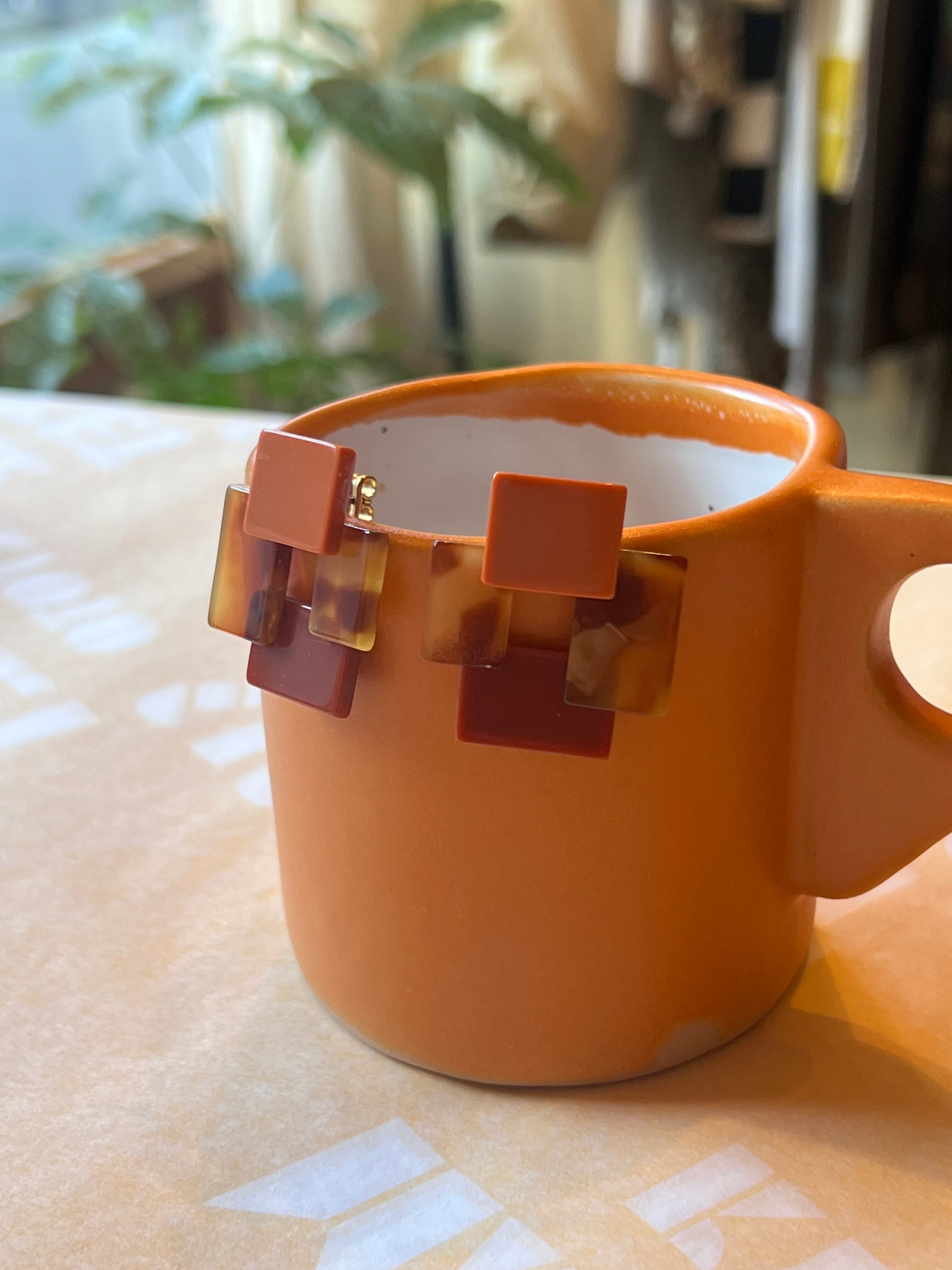 主にレジン素材を使用したアクセサリーのコレクションは、小さなファクトリーでハンドメイド制作されている。