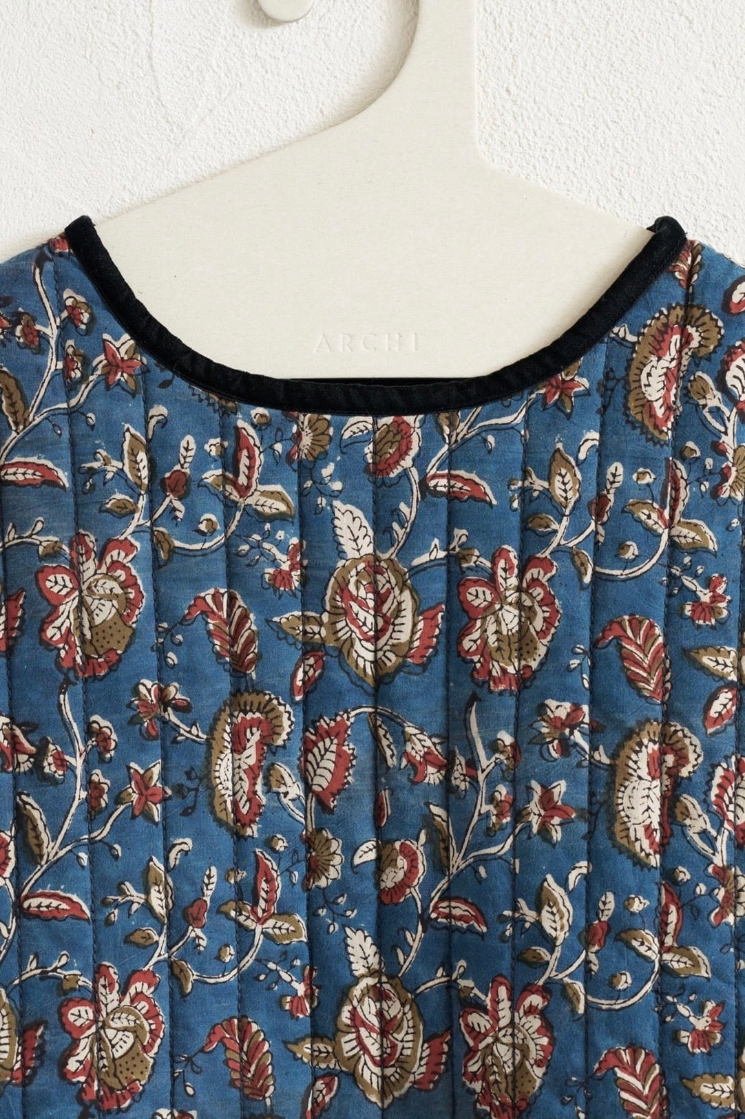 インドの伝統工芸・ブロックプリントの生地をキルティング仕立てにしたテキスタイル。前後でキルトステッチの柄を変えたデザインで、どちらを前にしても楽しめるプルオーバーベストです。縁取りにはベロアのパイピングを施し、柔らかくまとまりのある印象に。同シリーズのオールインワンとのコーディネートもおすすめです。
