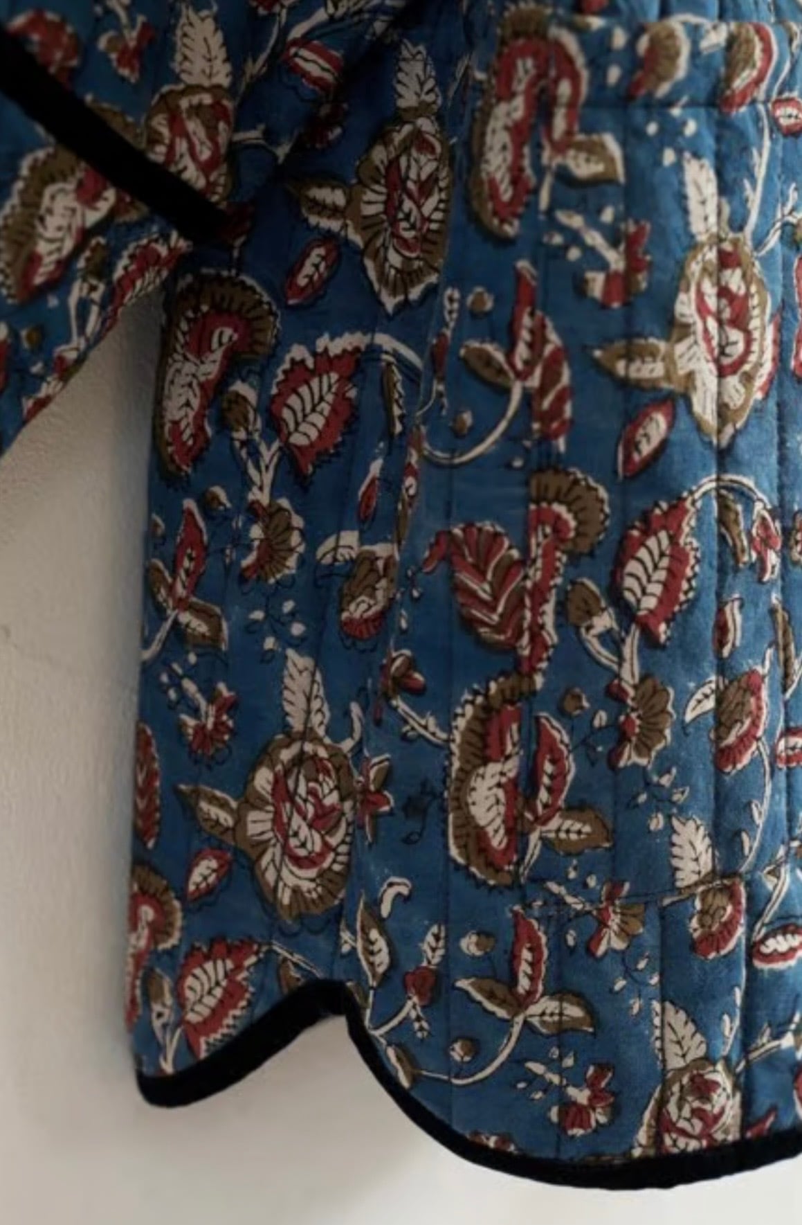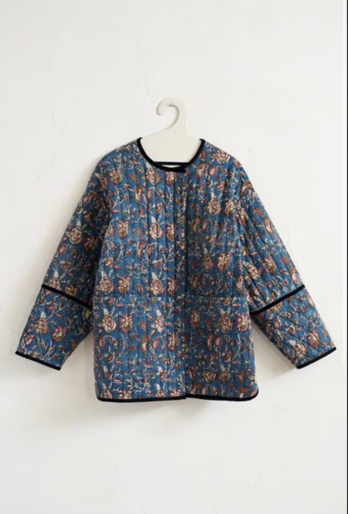 インドの伝統工芸であるブロックプリントの生地を、ふっくらとしたキルティング仕立てに。ゆったりとしたオーバーサイズで、重ね着もできるジャケットです。コーディネートの主役になるような存在感がありながら、ベロアのパイピングで全体を上品にまとめています。
