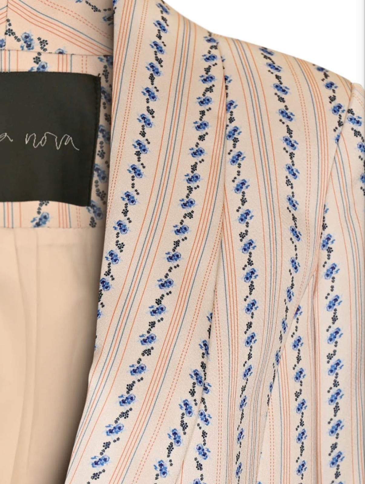 ステラ・ノヴァの美しく夏らしいブレザー。レギュラーフィットで、フロントにポケット、細めのラペルが特徴です。やや長めの丈で、フロントはボタン1つで留めるデザイン。夏らしいブルーの花柄と、コントラストの効いたオレンジのストライプが美しいストライプ柄を演出します。同素材のパンツと合わせれば、クールで存在感のあるスーツスタイルが完成します。